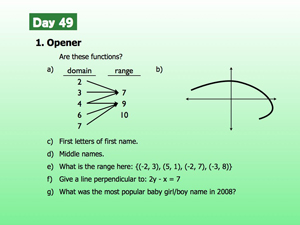 Textbook assignments and certain diagrams, for example, reference Prentice Hall's Algebra 1 (California Edition). The opener miscellany, for another example, is lifted from both Snapple® caps and Vital Statistics, a reference text which is just as good as Snapple® but in a different way. If you are a copyright holder (or know one) and I missed your attribution, please let me know via dan at mrmeyer dot com and we will make that right.
